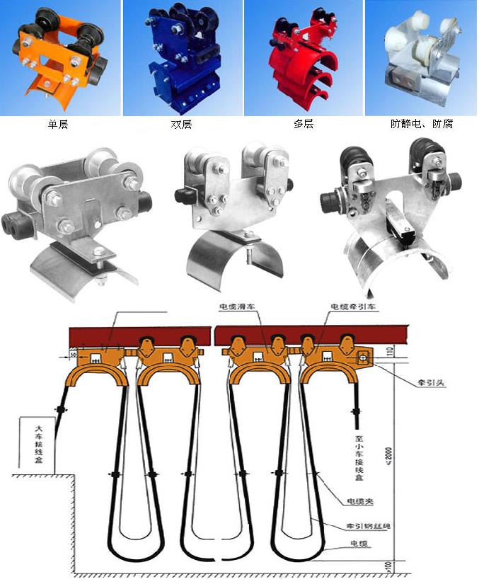 分為中載荷型、重載荷型、和輕載荷型,因此滑車走輪為Ф80、Ф63、Ф50的三種,承載能力≤50~150kg,每類按托板層數分為單層、雙層、三層,每類中有三種形式,首端為電纜牽引車,終端為固定掛線架,中間為電纜滑車。